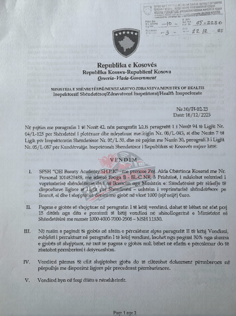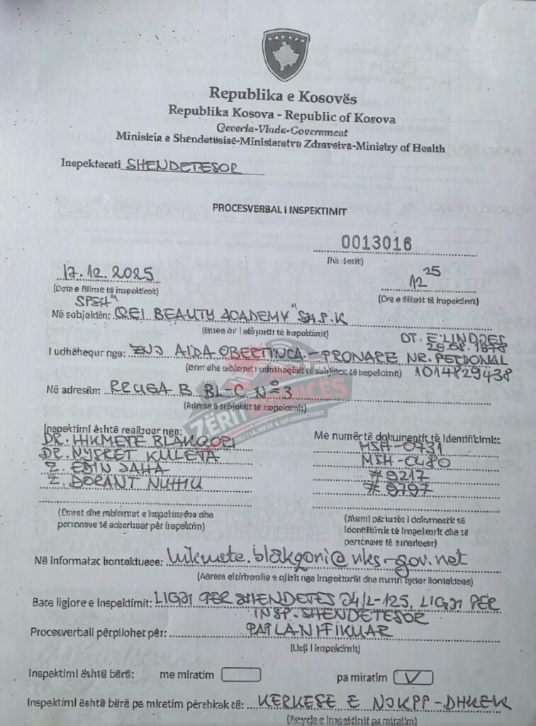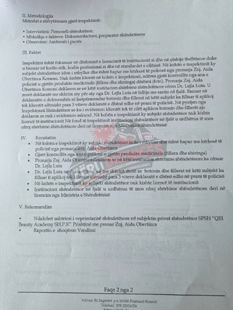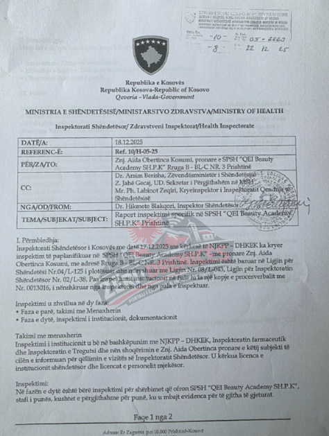 Një raport i Inspektoratit Shëndetësor ka nxjerrë në pah se një subjekt privat në Prishtinë ka ofruar për rreth tre vite shërbime të injektimit të botox-it dhe fillerëve pa licencë, në kundërshtim me legjislacionin në fuqi në Kosovë. Sipas dokumenteve të siguruara, subjekti “QEI Beauty Academy”, në pronësi të Aida Obertinca Kosumi, ka ushtruar këto shërbime pa qenë i pajisur me licencë përkatëse. Çfarë konstatoi inspektimi? Gjatë një aksioni të zhvilluar në dhjetor nga Policia e Kosovës në bashkëpunim me Inspektoratin Shëndetësor, është konstatuar se: subjekti nuk posedonte licencë për ofrimin e shërbimeve injektimi i botox-it dhe fillerëve është kryer për rreth 3 vite nuk ka pasur evidencë të klientëve të trajtuar Në raport thuhet se aktiviteti është ndërprerë përkohësisht dhe subjektit i është ndaluar ushtrimi i veprimtarisë. Sa ishte gjoba? Pas inspektimit, me vendim të inspektores Hikmete Blakqori, subjektit i është shqiptuar një gjobë prej 1,000 eurosh. Sipas rregullave në fuqi, kjo shumë mund të reduktohet për 50% nëse paguhet brenda afatit të përcaktuar. Krahasimi me raste të tjera Në raste të tjera të ngjashme, subjekte të tjera janë gjobitur me shuma më të larta për shkelje të ngjashme, çka ka ngritur diskutime në opinion mbi mënyrën e aplikimit të masave ndëshkuese. Çfarë thonë institucionet? Nga Ministria e Shëndetësisë është konfirmuar se gjoba ndaj këtij subjekti është paguar, ndërsa biznesi nuk është licencuar deri në momentin e përgjigjes zyrtare. Megjithatë, sipas të dhënave të publikuara, subjekti ka vazhduar të njoftojë për oferta dhe termine për klientë edhe pas vendosjes së masave. /Zëri i Drenices/ Related PostsQytetarja emocionohet në Mitrovicë, përqafon Vjosa Osmanin... Momente emocionale në Mitrovicë gjatë takimit me Vjosa Osmanin Presidentja e...Read moreOsmani në Mitrovicë: Nuk po bëj fushatë,... Osmani: Takimet janë për falënderim, jo fushatë Presidentja e Kosovës, Vjosa...Read moreAlbin Kurti feston ditëlindjen, surprizohet nga bashkëpunëtorët Atmosferë festive në ditëlindjen e Albin Kurtit Kryeministri i Kosovës, Albin...Read more Post navigation A do të rriten çmimet në Kosovë? Ministrja paralajmëron masa të reja për naftën dhe ushqimet Klinika në Prishtinë kapet pa licencë – Inspektorati e mbyll dhe e gjobit me 3,000 euro