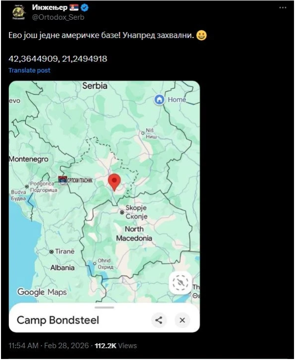 As part of reactions to the US and Israeli strikes on Iran, some Serbian social media pages are spreading calls for Iran to also hit US bases outside the Middle East. In particular, Serbian citizens are reportedly sending the coordinates of the US military base Bondsteel in Kosovo to Iranian authorities, considering it a potential target for future attacks. Social media posts express this stance openly, such as this example: “Here’s another US base! Thanks in advance.” However, Kosovar authorities have emphasized that they have not received any official information regarding these calls. “No, we have not received such information,” said Liridona Gashi, spokesperson for the Ministry of Defense, briefly. ZID also sent questions to KFOR, which stated they would respond within a day. The text will be updated once an official answer is received. The situation remains highly tense, as Iran has warned it will retaliate by targeting all US bases in the region, as well as Israeli territory. Many of these bases have already been identified as potential targets. Following the initial strikes on Iran on Saturday, Kosovo’s institutional leaders expressed support for the actions taken by the United States and Israel, emphasizing that the goal of the attacks is the destruction of Iran’s nuclear program. “No, we have not received such information,” said Liridona Gashi, spokesperson for Kosovo’s Ministry of Defense, dismissing any possibility that the Bondsteel base could be a target for Iran. Related PostsQytetarja emocionohet në Mitrovicë, përqafon Vjosa Osmanin... Momente emocionale në Mitrovicë gjatë takimit me Vjosa Osmanin Presidentja e...Read moreRama Warns: If Kosovo Is Threatened, Albania... Albania Supports Kosovo’s Independence Albanian Prime Minister Edi Rama reaffirmed Albania’s...Read moreStanding with the U.S. Against Iran —... Soon after the first bombs fell on Iran—igniting a conflict...Read more Post navigation Burj Khalifa and Other Landmarks Turn Off Lights Following Iranian Drone Attacks The Rule of Ali Khamenei and the Three Pillars of Power — What Were They?